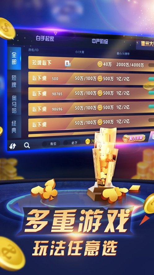 开心天地是一款刺激好玩的多人棋牌手游,游戏提供了很多种玩法,像斗地主、捕鱼、麻将等游戏都包括在内,能满足大众的各种棋牌游戏需求,线上随时都有真实玩家在线进行棋牌对战,玩家可以一键匹配对局,也能自定义创建房间邀请好友来一起打牌,感兴趣的话快来下载体验吧!